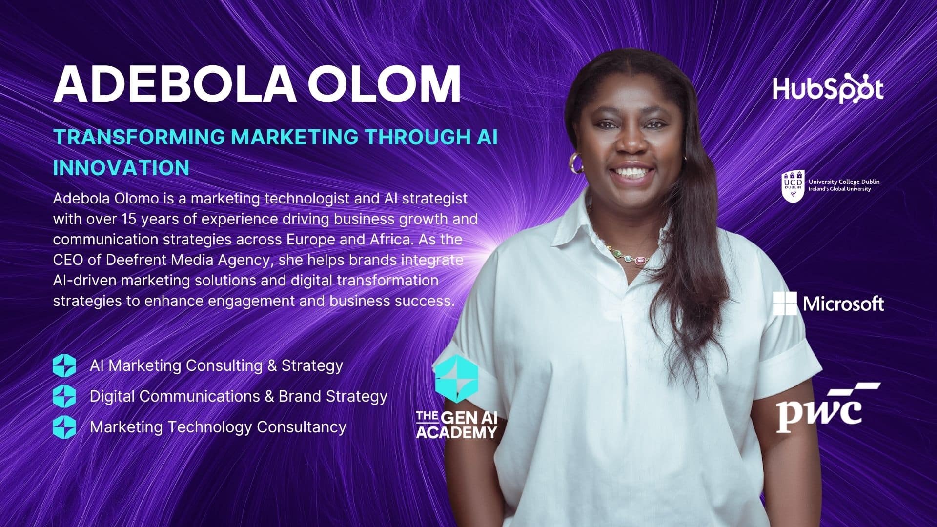 Durch ihre Führungsqualitäten, ihr Engagement und ihr Fachwissen treibt Adebola Olomo weiterhin bedeutende Veränderungen an der Schnittstelle von KI, Marketing und Diversität voran und sorgt dafür, dass Unternehmen und Fachleute in die Lage versetzt werden, selbstbewusst in die Zukunft zu blicken.