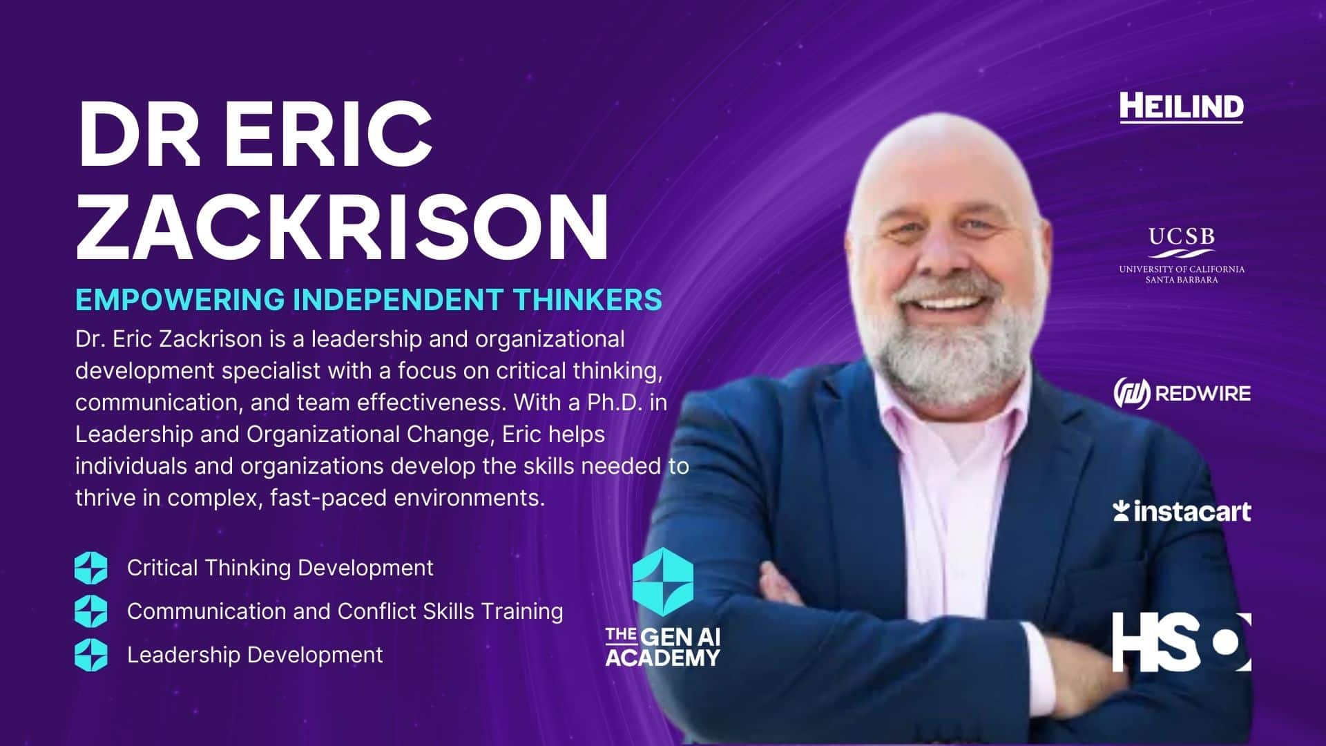 Dr. Eric Zackrison ist Spezialist für Führungs- und Organisationsentwicklung mit den Schwerpunkten kritisches Denken, Kommunikation und Teameffektivität. Mit einem Doktortitel in Organisationskommunikation und einem MBA verbindet Eric in seiner Beratungstätigkeit und seinen Schulungen akademische Strenge mit praktischer Erfahrung, um Einzelpersonen, Teams und Organisationen dabei zu helfen, die Fähigkeiten zu entwickeln, die sie benötigen, um in komplexen, schnelllebigen Umgebungen erfolgreich zu sein.