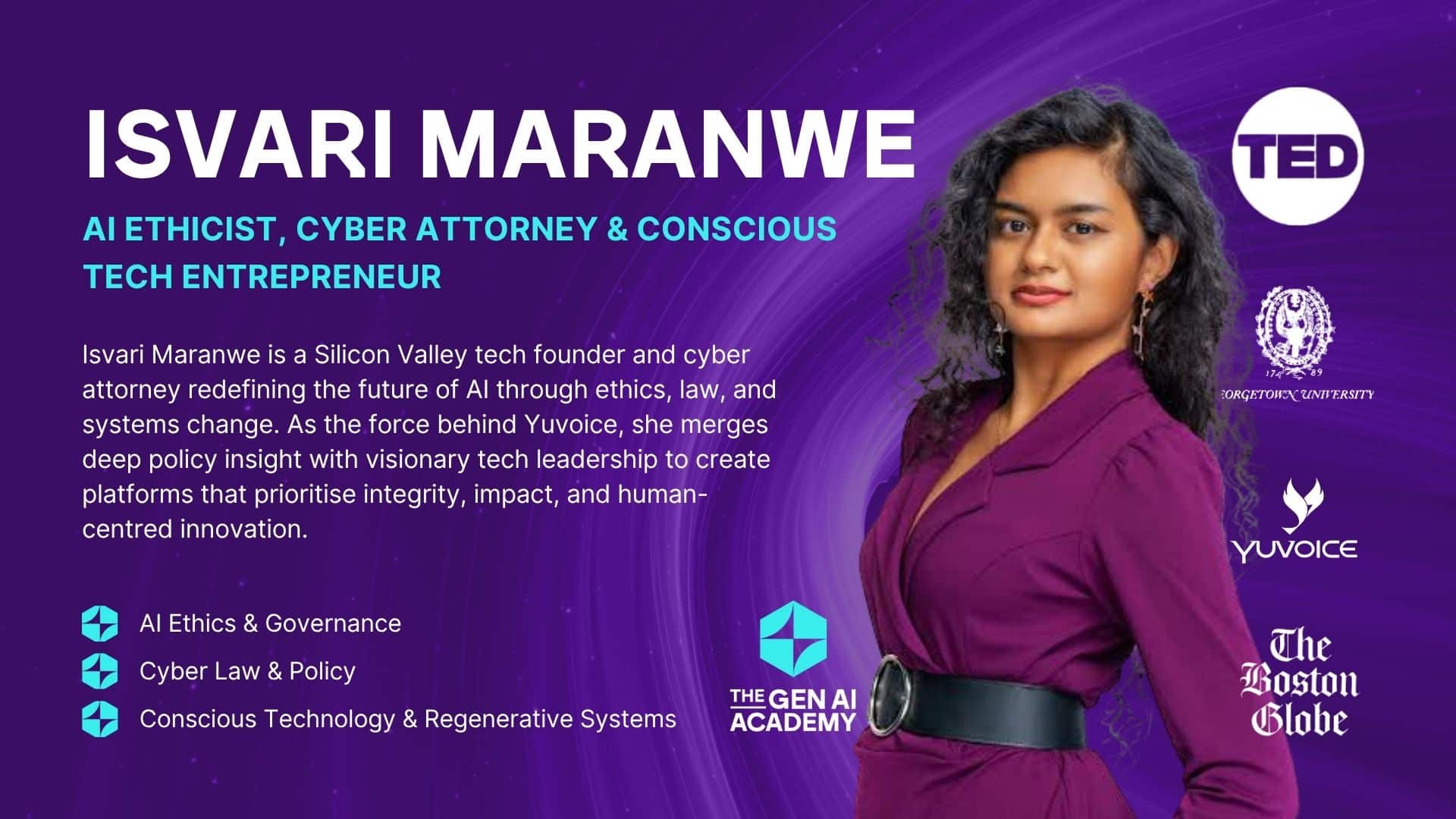 Isvari Maranwe ist eine Technologiegründerin aus dem Silicon Valley und in Washington D.C. ausgebildete Cyber-Anwältin mit einer unverwechselbaren Stimme an der Schnittstelle von Recht, neuen Technologien und bewusstem Systemdesign. Heute lebt sie in London und bringt eine seltene Kombination aus juristischer Expertise, politischem Verständnis und systemischem Denken in die globale Debatte über KI, Ethik und kollektiven Wandel ein.